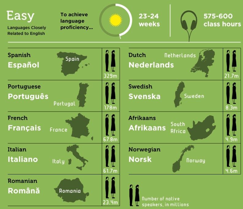 영어를 사용하는 사람들이 가장 배우기 쉬운 언어 중 하나가 스페인어라는 조사 결과가 있다. 스페인어는 영어와 동일하게 로마자 알파벳을 사용하고 있으며, 한글처럼 단어를 철자 그대로 읽을 수 있다. 영어를 모국어로 사용하지는 않지만 초, 중, 고등학교 12년 동안 영어를 배웠기에 어느 정도 비슷하게 쉽다고 느낄 수 있다.
